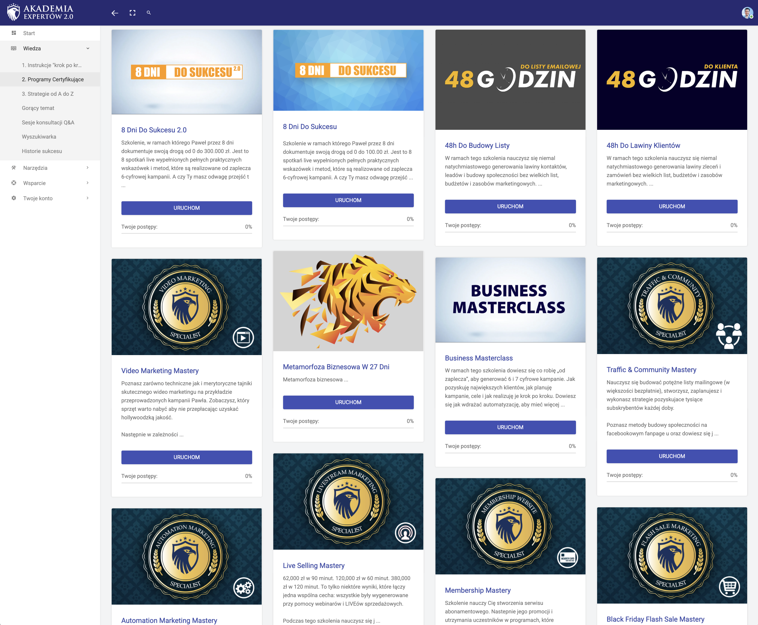 Obowiązkowo od Marketingowej Masterklasy. Następnie przejdź do materiałów w Akademii Expertów. Jeśli chcesz szybko wygenerować wynik – przejdź do 8 dni do sukcesu.